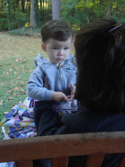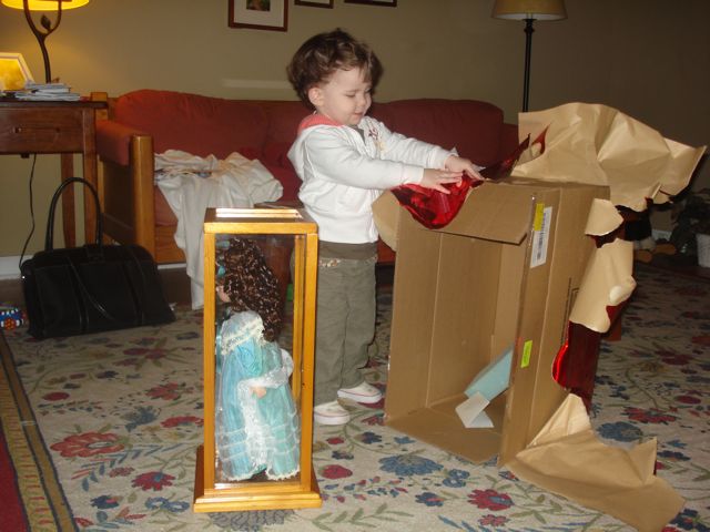 Arriving at home, along with cards and phone messages from the grandparents who we had just seen a couple of days before, two new packages were waiting. They were from the Popes next door. They always remember Claire’s birthday because she was born exactly the day old Aubry Pope died, and they seem to be big fans of Claire. One present was a great big Winnie the Pooh “find it” book from Faye. The other was a beautiful doll in a glass display case. We went next door to thank them and have a nice visit. Well, Kit had a nice visit anyways. Claire spent most of the time