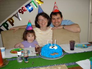Claire had been talking about this day for a long time. For months, she had been asking, “When is my birthday?” Unlike last year, this time she really had the drill down. She must have been inspired by all the birthday parties at school. She has been reminding us not to forget the balloons and party hats and birthday cake — especially the birthday cake! She had been specifying a “red cake!” for a few weeks, but in a surprising and provocative move, she switched to blue in final days before her party. Further, she clarified that she was talking about the frosting, and she did not have a preference on what the inside looked or tasted like, just as long as it was cake.