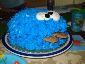 Then it was off to said grocery store to pick out a cake. I was prepared to get burned on this too. If Party City could not blow up some balloons in 24 hours, how could I expect someone to bake a special cake in that time? I had just recently given up on the idea of baking one at home, because that was going to take away time from other fun. Not surprisingly, the grocery had no blue cakes ready to go. But they did have a really cute”character cake” with the frosting done to look like a furry brown unnamed Sesame Street character. I asked the nice lady at the bakery if they could do that one in blue. She said no, but they could do a Cookie Monster, who always comes in blue, and they could have it ready first thing in the morning. Now that is more like it!