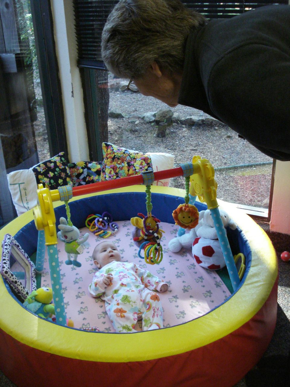 The teachers suggested putting Molly in “the pool”, which is a round padded area in a sunny corner of the room. The main point of the pool is that is has short padded walls a few inches tall, so she is somewhat protected from Bobby and the like. We laid Molly down in the pool, and she did not complain a bit. She was immediately transfixed by all the neat stuff to look at. There were big windows with curly trees right outside, toys and mirrors in the pool, and interesting sounds from a few other babies.