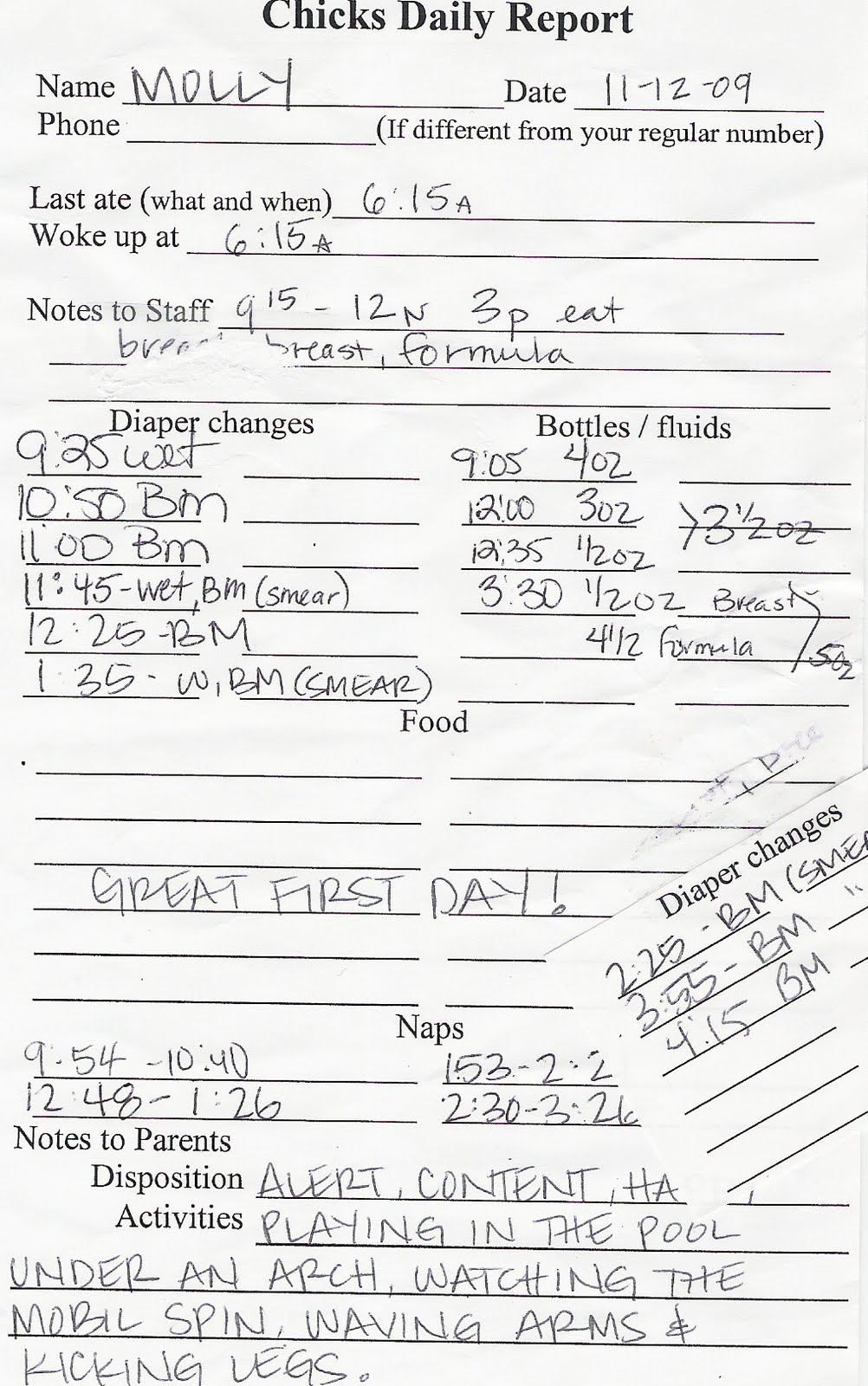 That afternoon when we picked Molly up, they said she had a great day. She did a lot of cooing and sleeping, and she loved to watch the other babies. I think Molly is in good hands and probably having more fun at school than at home.