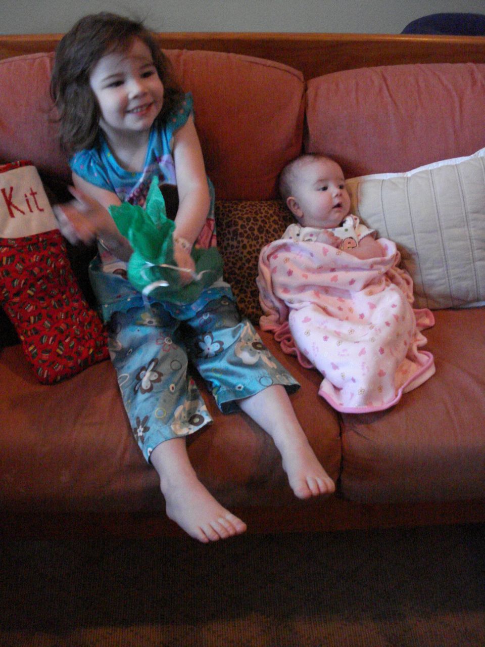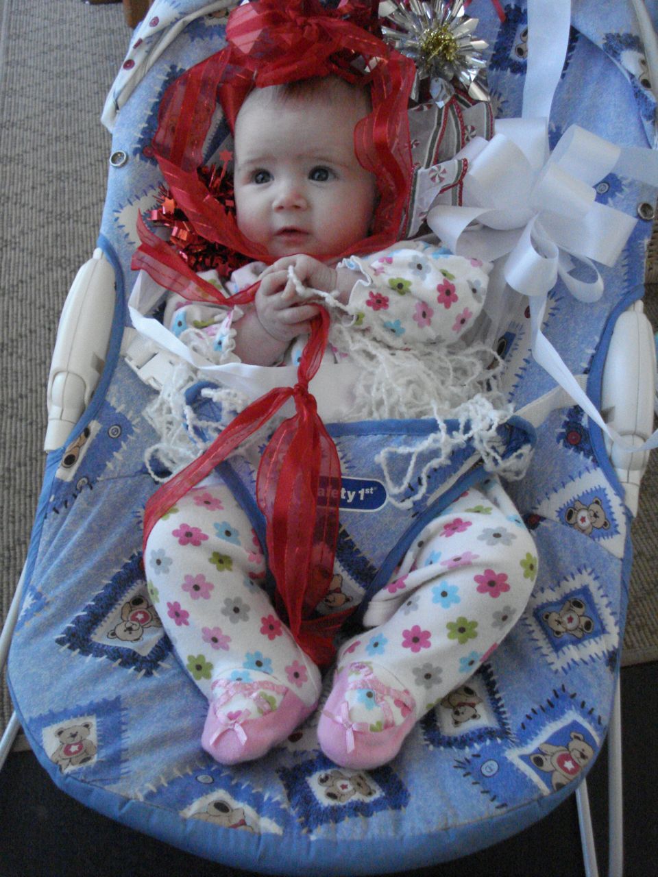 At three months old, Little Molly was not as excited about Christmas. In fact, this year, she could not tell Christmas from the Fourth of July. She was a little worn out from all the excitement of entertaining her aunt and uncle and grandparents on Christmas Eve, and she slept quietly upstairs almost the entire Christmas morning, through all the gift exchange. She did not have a chance to appreciate her many presents, including one from Santa. Molly’s time to enjoy Christmas will come soon! You could say she was the big present to us this year.
