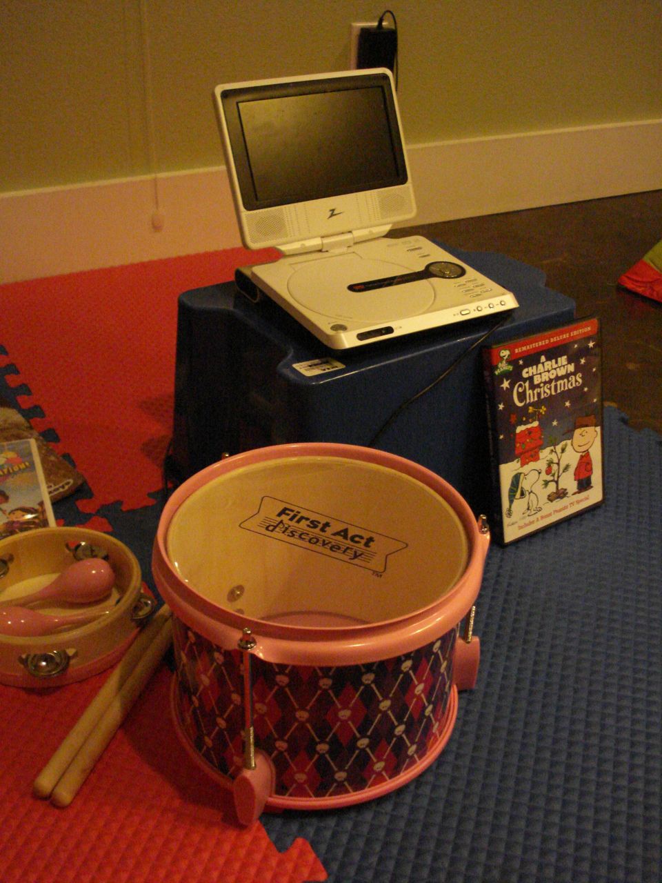 - Claire’s night ended watching A Charlie Brown Christmas on her little potable DVD player. Gradually five or six of us ended up watching over her shoulder. Claire played her tambourine to the show’s music and distributed her other instruments to the rest of us for additional percussion. We did not sound good, but it was fun.