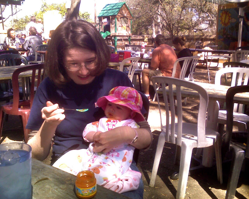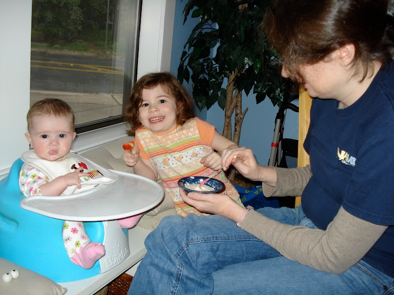 This was a whole-family event. Claire was super excited about Molly trying solids. She understandably thought that rice cereal was some sort of breakfast cereal and suggested that she and Molly have it in the morning. At her request, we did make some rice cereal for Claire to try it out and help encourage Molly. Claire was not impressed but did eat some just out of pure enthusiasm. She made a point of showing Molly how to do it, eating it with big sweeping motions. Kit then gave Molly a spoonful of the mush, and Molly took a bite. She seemed surprised but excited by it. Of course, she ended up pushing most of the mush out with her tongue, but it was a good start. We kept this up for another few minutes, and Molly ended up doing a little better keeping the food down. She really had fun with it and seemed to think the whole thing was sort of a game. Also, she seemed to feel important and grown-up sitting up in the new Bumbo seat that Kit had picked up just that day just for this occasion.