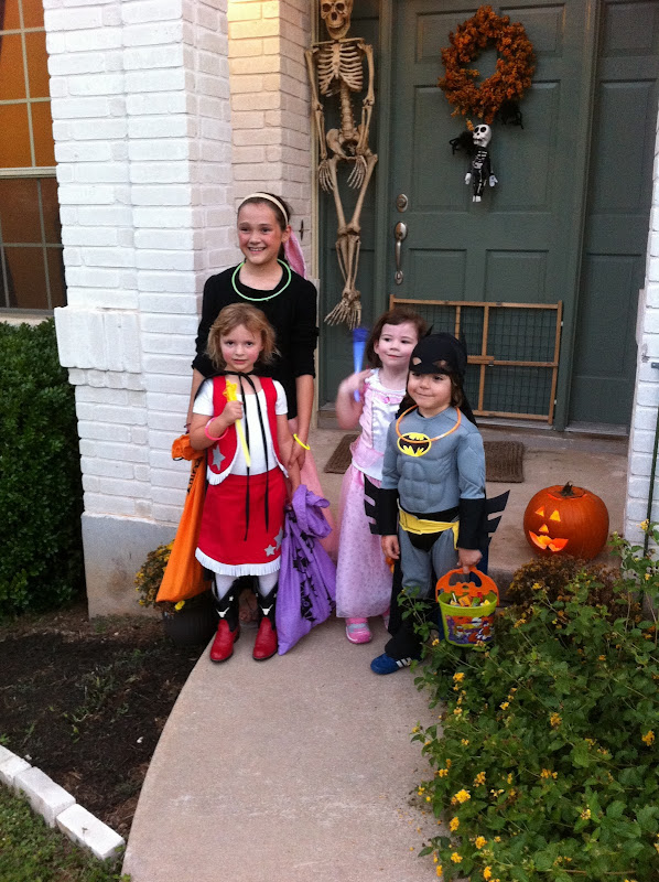 Halloween is upon us again. Just like last year, we joined Claire’s school friend Megan for Halloween festivities in their Mount Bonnell neighborhood. The neighborhood has an annual Halloween parade — actually, a loose gaggle of spooky kids and their accompanying parents, lead by ceremonial bagpipes. Immediately following the parade, the kids and accompanying parents fan out for tricks or treats.