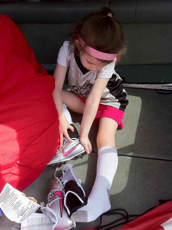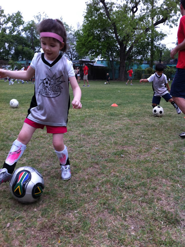 At halftime Claire seemed concerned and a little dismayed, and she sort of wanted to just go home. She said she could never get to the ball. I told her that she was running faster than almost any kid, and if she gets a chance, don’t worry and don’t wait; just kick the ball as hard as she can (I guess nevermind which direction the ball goes). In the second half, I prodded myself to yell out “Kick the ball, Claire!” whenever she was in range. She did get a few kicks on the ball this time around. She even managed to clear the ball from her home team’s goal area a couple of times. This seemed to make her feel marginally better, although she still was not having too much fun. When the final whistle blew, and the game seemed to stop, she ran over to me and said, “Is the game over?” I said, “I think so”, and she replied, “Yeah!!!” I was proud of her for sticking through the whole game and even giving it something extra in the second half. As far as I can tell, the Tornadoes probably lost, but the game’s outcome did not seem to be of any real significance to anyone.