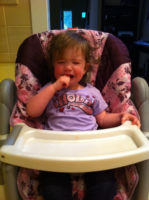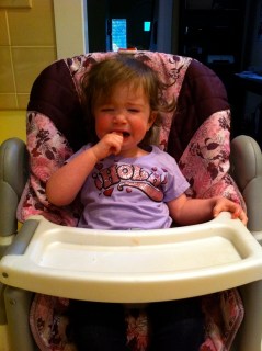 We did not go in with great expectations, either. Molly had been on another “down cycle” with her eating lately, apparently due to a cold and/or teething, both of which seem to badly suppress her appetite. She is often hostile to the very idea of food. Most mornings when I set her down for breakfast, Molly looks like this: