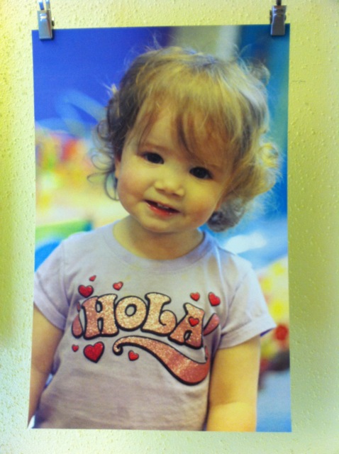 Molly’s picture was featured, along with a few other kids, in a display that everyone sees right when they enter the day care. And she is, of course, wearing her signature “HOLA!” T-shirt.