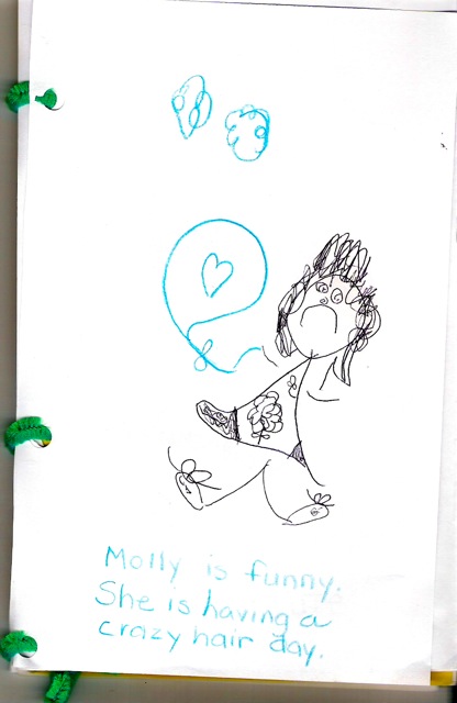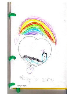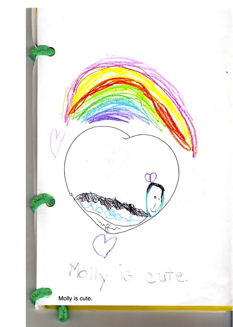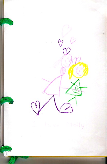 As her present for Molly’s second birthday, Claire made a book for about Molly for Molly. This was done with inspiration and the help of gramma Noni, who assembled the book, while Claire came up with all the words and pictures. There is one thing about Molly per page, with an illustration for each. The book reads: