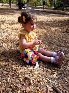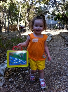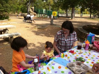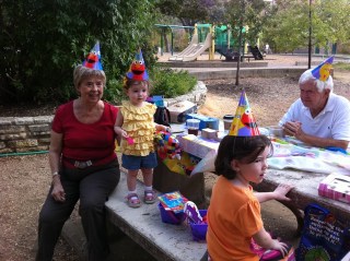 We kept the celebration small, just family this year. Noni and grandpa Phil were in town for the occasion, so they and Molly had a lot of great face time together. Kit wanted to do something that Molly would really like, so we decided on going to Pease Park and just letting her go nuts. We brought some Sesame-Street-themed party supplies to make it festive. Molly and Claire both got identical party favors, which were completely mixed up together by the afternoon.