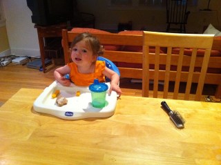 The day started just before 7 am, with Claire already downstairs eating breakfast and prepping for school. I sat Molly down in her little blue toddler seat for a normal breakfast, starting with a fresh sippy cup of whole milk and an English muffin with cream cheese. Molly almost immediately began to scold her breakfast. She literally shook her finger at her food, saying “No!” sharply a few times, as if it had done something wrong. Her mixed feelings about food continue to age two, I can see. Within a minute or two, though, she was happily eating the naughty English muffins.