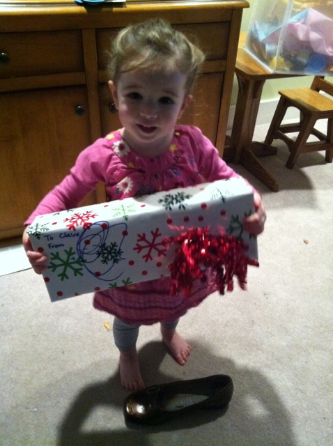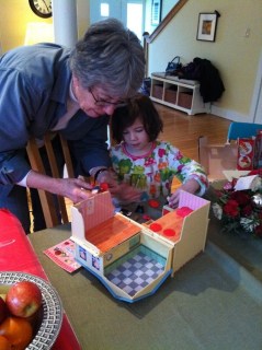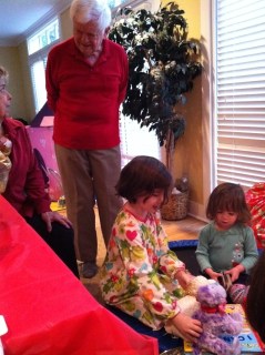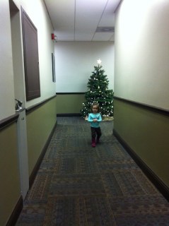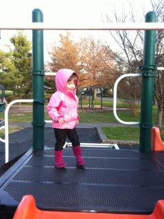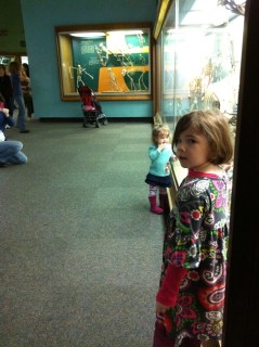 Back a Tim’s, Claire and Molly settled into more fun with their aunt and uncle. Claire loved to hang out in Tim’s basement with Tim. She kept him cornered down there for an hour at a time, chatting him up and playing with the exercise equipment down there. When I went down to see what they were up to, they were sitting on exercise balls talking. Tim, who has never really known a 6-year-old girl, as far as I know, explained that they were “just talking about Fancy Nancy and stuff like that.” Claire also loved the chin-up bar in the basement. She would hang from it and swing like a monkey.