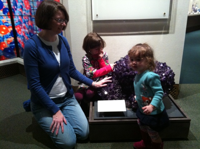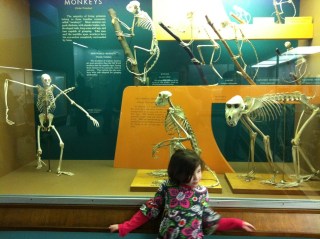 Egyptian artifacts around the corner, past the insects, which Claire quickly bypassed because she was creeped out. Claire was fascinated that the Egyptian mummies were real people from long ago. She was a little bit surprised that mummies were actually real, perhaps thinking they fell into the not-so-real realm of fairies and ghosts. Kit got Claire a kids’ book about ancient Egypt from the museum store before we left, and it quickly turned into Claire’s favorite new book. Claire also loved the animal skeletons, especially the monkeys since those are her class mascot at school. And she loved the gems, rubies, and diamonds exhibit. She also liked the dinosaurs a lot. Basically, Claire loved the National Museum of Natural History, as did we all. Molly liked the museum too, most of all when we let her out of the stroller to walk around on her own. She seemed to like the skeletons best of all.