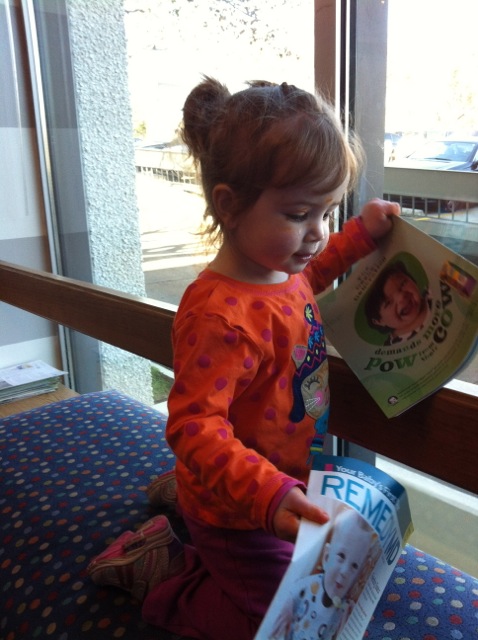 The flight went surprisingly well. We thought it might be tough for Molly to sit more or less still in a seat for three hours, and to not scream and cry when she inevitably got frustrated by sitting there so long. But she actually seemed to enjoy the flight quite a lot. She seemed to enjoy the novelty of the airplane experience. She browsed in-flight magazines and catalogs from the seat in front of her. Then she collected all the duplicate in-flight magazines and catalogs from the adorning seats. Then she stacked them all on the seat next to herself just so. Don’t even think about touching those magazines! Don’t so much as look at them! Any disturbing of the in-flight magazine stack immediately caused a shrieking protest from Molly. But she always settled right back down once you … left … the … damn … magazines … alone.
