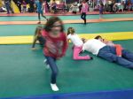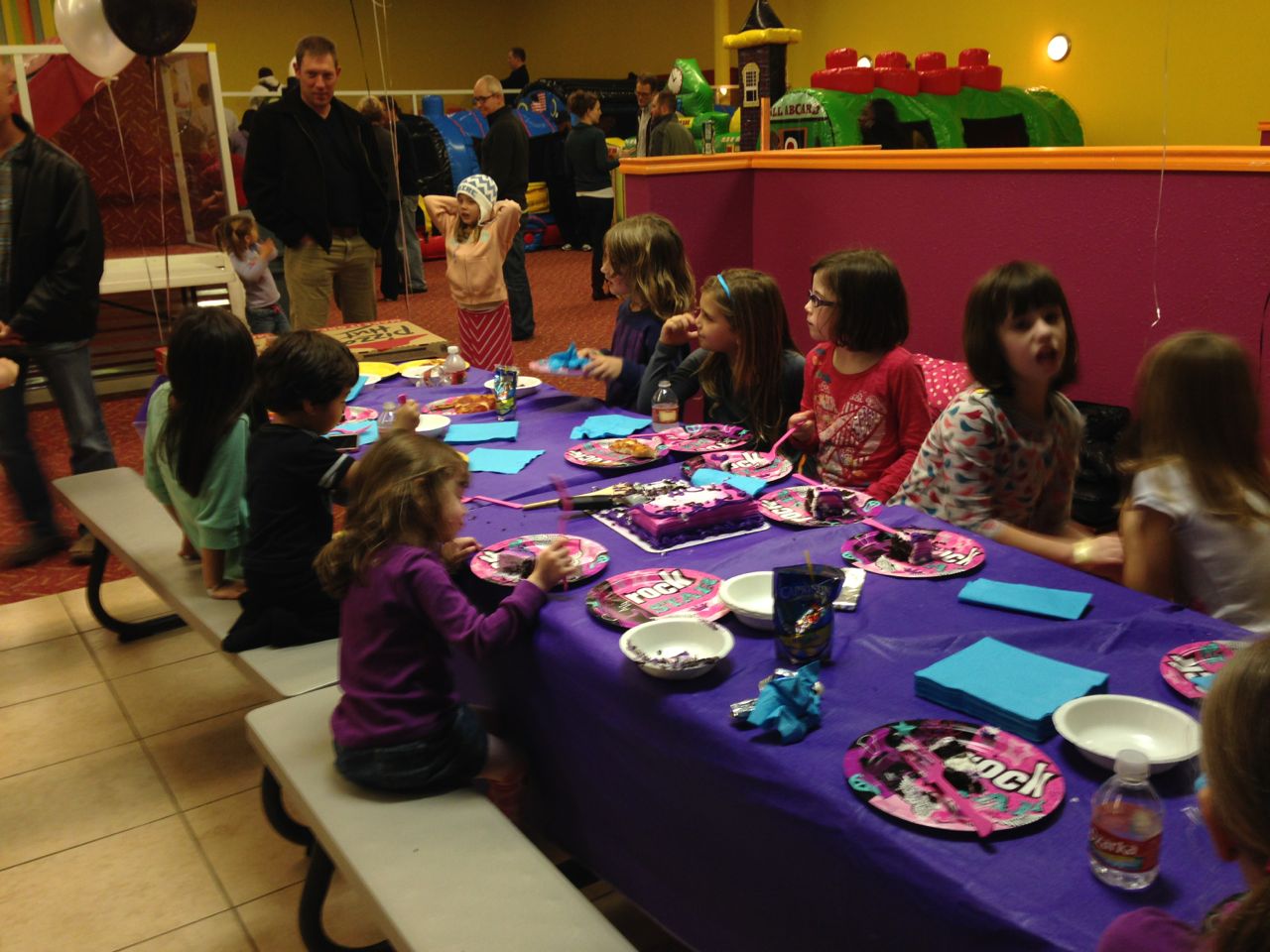And so we had her birthday at the perennially favorite spot, the largest and greatest indoor trampoline you can imagine. The kids had a great time. The girls were still young enough that they wanted us parents out there playing with them. It was myself and Cullen, the dad of Claire’s friend Maddie, who took on the important duty of “bouncing” the kids. This involved the girls laying all around a parent on the trampoline, then the parent jumping up and down as high as possible, trying to bounce the kids up as much as possible. This was tiring work, and soon sweat was dripping from my brow. The kids also liked to be chased across the trampoline, and some were quite good at taunting. I required many breaks to avoid collapsing in exhaustion.