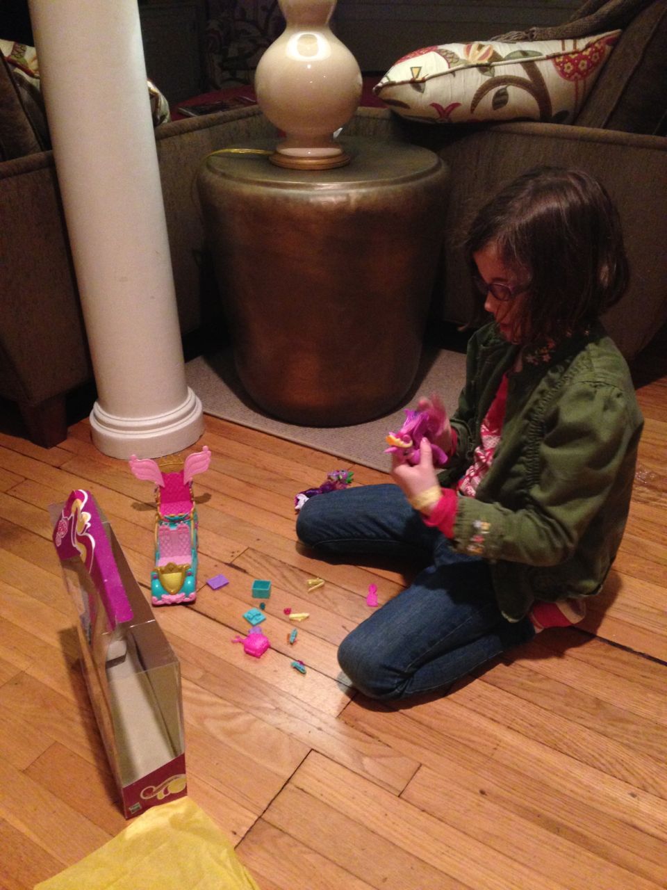 This year, Claire knew ahead of time what some of the kids were going to give her for presents. They basically just told her at school ahead of time. The two big must-have items this year were My Little Pony stuff and a Rainbow Loom. Claire adores My Little Pony and wants to know who your favorite characters are (Rainbow Dash and Pinky Pie of course, and Apple Jack is great but under appreciated). Some of the other kids at school think My Little Pony is babyish, but Claire stands her ground. She just loves that cute little ponies. The other big item was a Rainbow Loom, a rubber-band loom that is super popular at school. Claire got to take hers to school and use it on the playground and the bus, like her friends.