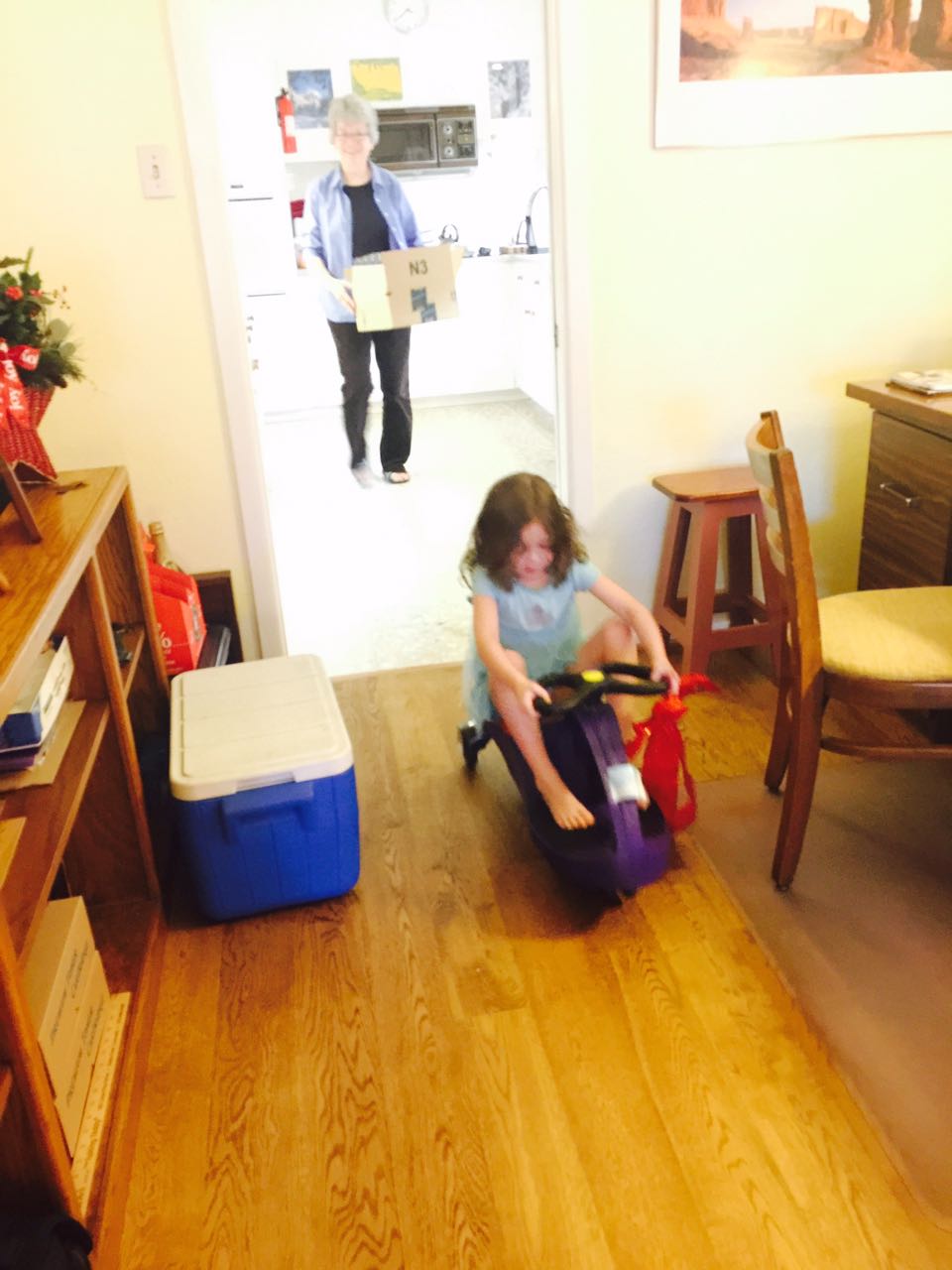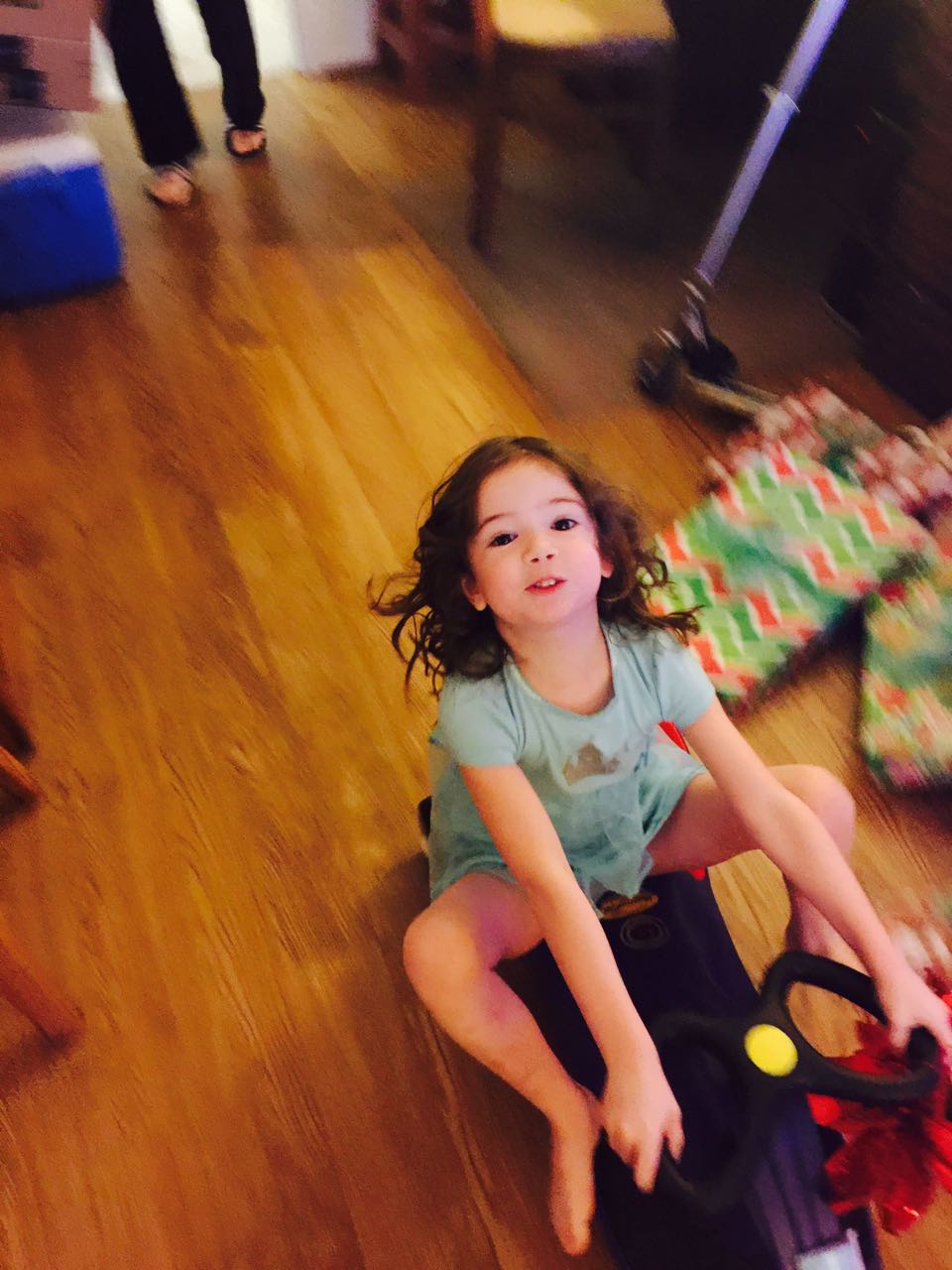Anyways, Santa managed to find Claire a remote controlled indoor/door min-drone. It is a quadra-copter about the size of your palm, and with practice, you can fly it around the house. It was a tough start, getting hung up on the ceiling at first and later getting tangled up in Muffin’s tail hair. But Claire started to get a hang of it with practice. Santa gave Molly a Plasma Car, which is a 4-wheeled scooter you can ride around the house or a sidewalk. It was a perfect fit for Molly, and she spent most of Christmas day wheeling around the house.