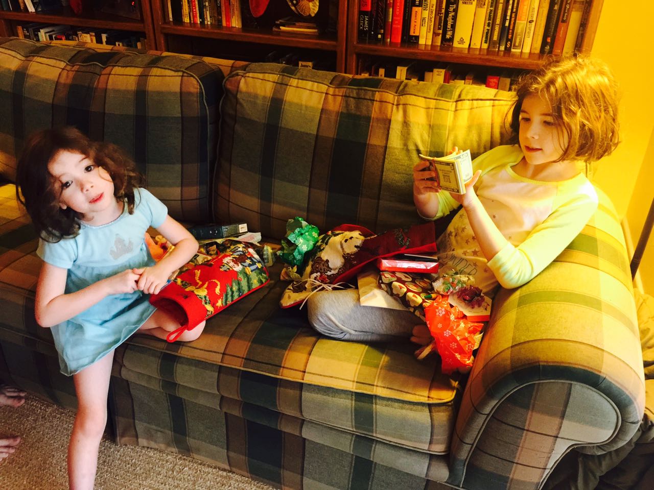 The pile of presents from each other was huge and sweet. A highlight was a hand-made book telling the history of everyone in our family, both Purdy’s and McGonigle’s. It was meant for Claire and Molly to have and read decades from now, but we all got a copy of this amazing book. There were lots of other presents, everything from Playmobil sets to fitness bands to the Claire & Molly annual art calendar that I normally make.