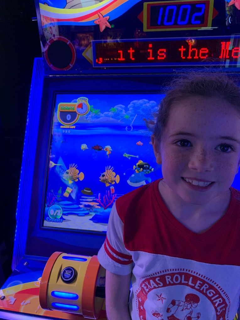 Molly totally earned 1000 tickets on the game Pirate’s Hook at Pinballz Arcade today. Molly and I work as a team. She times the fishing pole while I reel in the fish as quickly as possibly. We’ve can usually came away with 20-30 tickets in a solid round.
