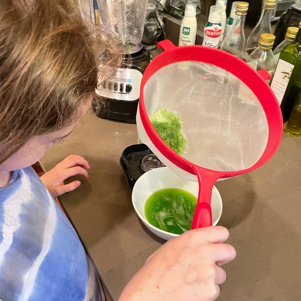 So we trimmed some wheatgrass (it’s indistinguishable from “regular” grass), tossed it in the blender with some water, and strained the juice. The resulting juice was supposedly healthy but had the bright fluorescent green color of lime Jello.