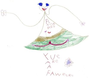 Claire’s drawing has taken a jump in sophistication lately. Her recent pictures now include large, complex scenes and a range of ideas and emotions (not just hearts/flowers/butterflies, although those are still quite prominent). Some of her pictures even have a little bit of a story to them. Here are a recent few samples, along with Claire’s explanation.