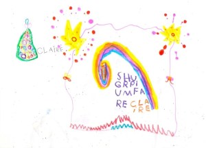 For a while, I’ve been posting the girls’ art to the portfolio section of this blog. But the portfolio is tedious and cumbersome to manage, so I’m going back now to doing the art as a regular blog. While Kit and I were in London, Joyce scanned our big backlog of the girls’ art. Here is a bunch of Claire’s art and other creations from the last several months…