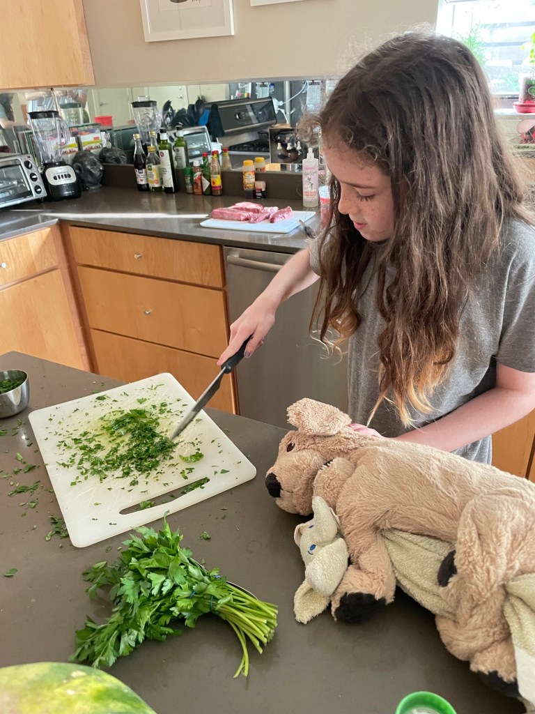 Here she is in action making one of her specialities, an Argentinian chimichurri sauce. She has been gradually doing more and more on her own. Tonight, she made the sauce 100% on her own — chopping and mixing parsley, garlic, and more — while I pan-seared some steak to go with it. 🤩