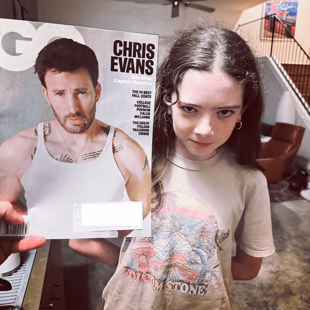 Molly was looking at the cover of GQ magazine, which had Chris Evans trying to look deep and/or tough. ”Why do they always try to look like that?” she asked. And then she struck the same pose.