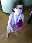 This outfit is a physical testament to Molly’s contrariness. She loves things to go different than how they are supposed to go, especially clothes. She often likes to wear her shoes backwards, intentionally swapping left and right shoes. One time she asked to wear her shoes backwards, meaning with the front on the back. Alas, it did not work. Molly often wears bloomers to bed. The other night, she wanted to wear them backwards. She even started to say she wanted to wear them upside down but, on visible reflection, stopped herself. She has learned enough to realize that, like the shoes, would not work. Darn physics!