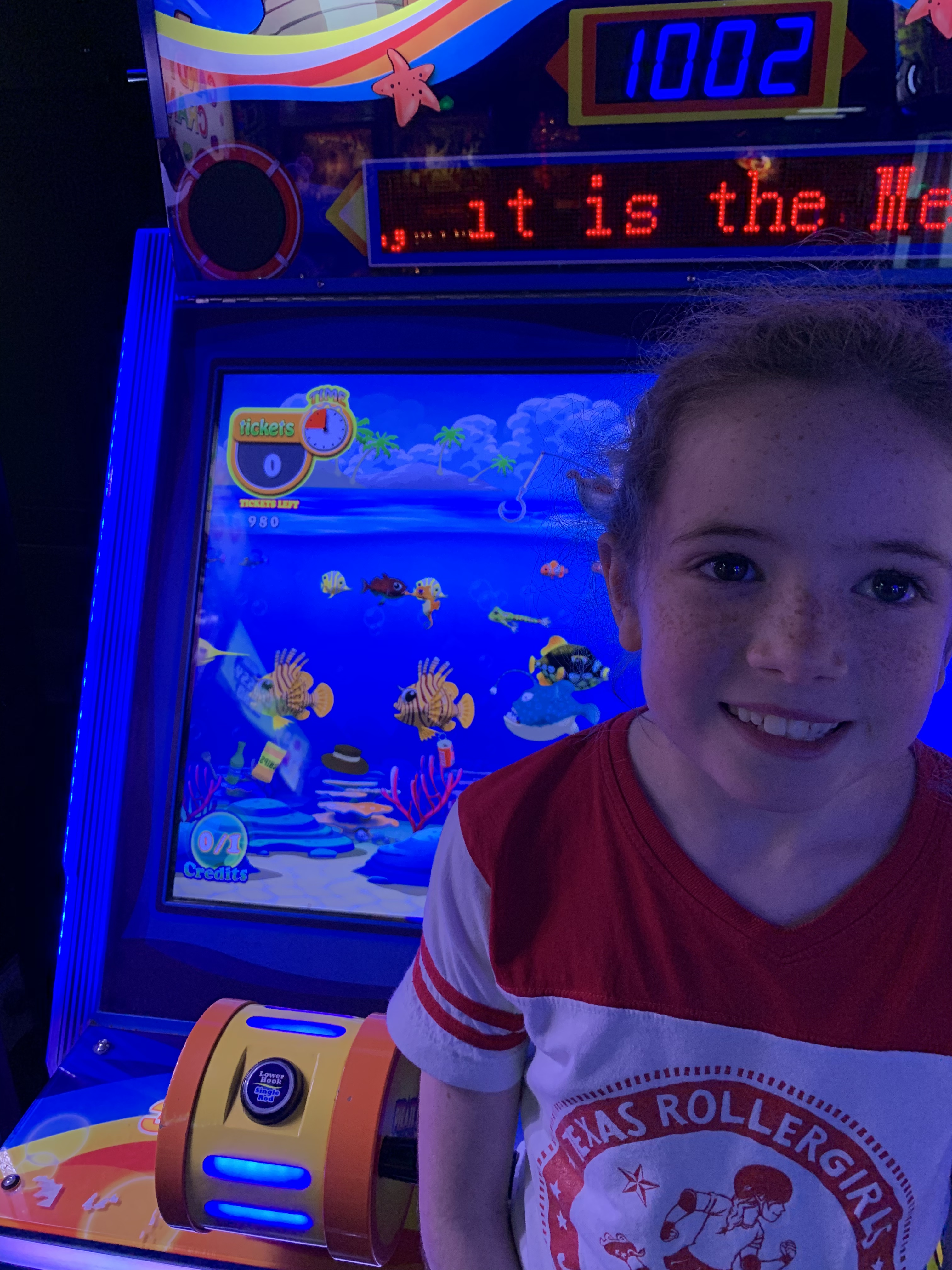 Molly totally earned 1000 tickets on the game Pirate’s Hook at Pinballz Arcade today. Molly and I work as a team. She times the fishing pole while I reel in the fish as quickly as possibly. We’ve can usually came away with 20-30 tickets in a solid round.