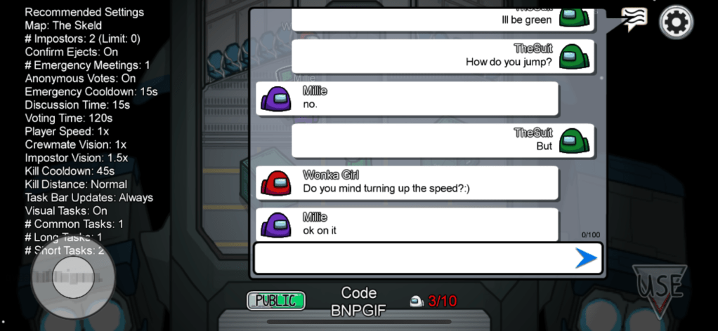 Most of the real action is in chatting to figure out who the imposter is. Here’s a sample of us goofing off. In this chat, Molly is “Millie” and I’m “TheSuit”. đ