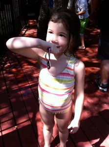 Anyways, Claire’s final day in daycare was a half-day that revolved around the completion of her swimming class. She had to swim across the width of the deep 9-foot deep pool, as opposed to the shallow 4-foot pool they normally use. Thanks largely to this swimming course, Claire is able to swim a little bit now, but she chose to cross the deep pool with the aid of a foam “noodle”. Using the noodle, she swam so quickly and confidently I would not have guessed it was even her from a couple of months ago. She got to the other side and received her gold medal for completion of the course. She was really proud and beaming with a huge smile.