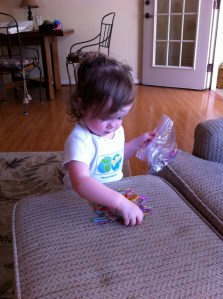 That said, it is worth noting that Molly took her first trip to Houston this weekend, to see my parents. Claire, of course, came along too. It was a busy and fun trip. We accidentally overcommitted on Saturday’s plans, which included two play dates, lunch out, and swimming. Molly’s favorite activity was probably sorting hair bands into a little plastic bag, which she did for at least an hour.