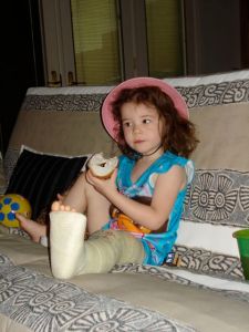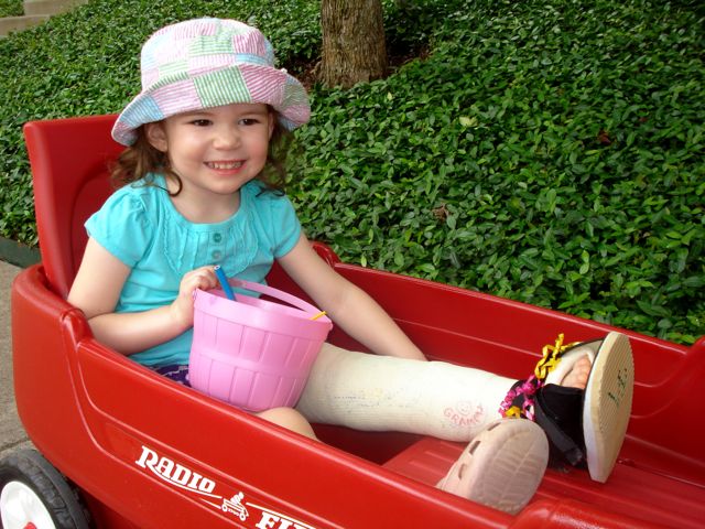 Claire slept well, and when we woke her up the next morning, she saw her cast and said, “Can we take this off now?” That’s when Kit and I explained that the cast was going to help her leg heal, and she needed to leave it on until June or July to make sure her leg was okay. Claire listened paitently and accepted the news calmly. Until we got the new routine figured out and saw a specialist who would tell us exactly if and when Claire should walk around, we settled into a new routine which involved a lot of carrying Claire around and letting her watch a lot of TV, including her new obsession, Finding Nemo. I wonder if she will forever think of that movie as the “broken leg” movie.