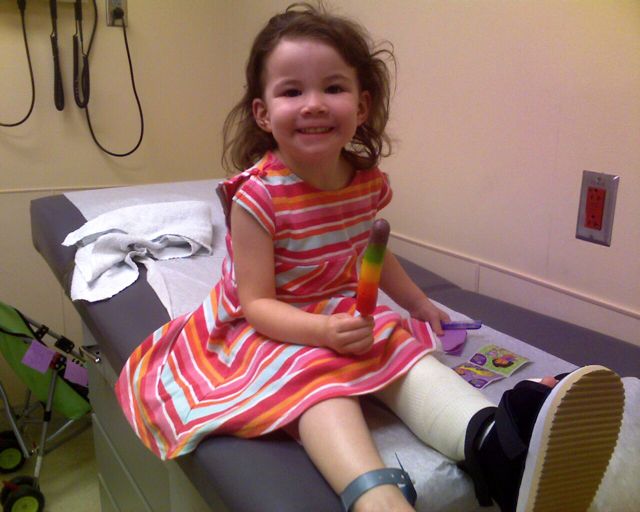 We went to the ER right by where Kit worked so she could come visit us and help provide some more seasoned medical perspective. Claire and I were very glad to see Kit. She made us both feel better from the shock of actually being in the ER, and she got to look at the x-rays to see what was really happening. After several hours of waiting, x-rays, more waiting, talking, taking calls from work, more exams, and more waiting, we left the hospital around 5:30 pm with a full-leg cast on Claire’s left-leg. Kit went back to the hospital to finish up her work late that night.