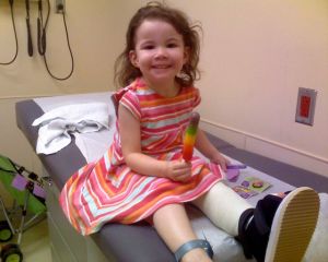 Today that all ended, and once again we got to see her left leg in its full glory. The process of taking her cast off — where they take that loud power saw and tear through the cast towards her flesh — did not go so well. There was screaming and resisting and crying. No amount of reassurance could convince this three year old kid that the power saw cutting into her leg was “okay.” Once it was over, Claire, in tears, said she wanted to see the other doctor instead, meaning the one who shows her the x-ray of her leg and talks to her about it.