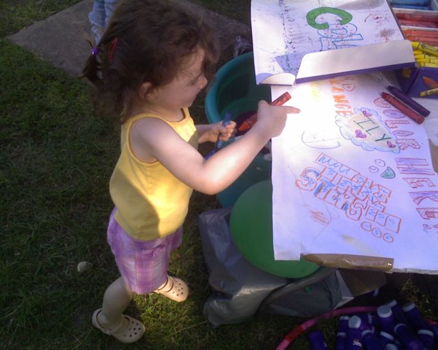We walked down the creek for about a half mile when we hit Reverchon Park and started to hear a crowd and some music. It was a festival of some sort. The minute I saw the inflatable “bounce house”, I nearly turned back before Claire (with her lower profile) could see it. I knew Claire would really, really want to go play in the bounce house, as she had enthusiastically done at many birthday parties. But I was not really “up” for a fair and not excited about keeping track of Claire and Muffin by myself in a crowded park. Just as I completed that thought, Claire saw the bounce house and yelled, “I want to go there!” I considered telling her we didn’t have time, or something along those lines. But the fact was that we did have time, and the only thing keeping me from letting her play was my own lack of energy and/or adventurism. Isn’t this the kind of thing childhood is all about? Stumbling apon a fair on a nice Sunday afternoon and getting to go play for a while? In retrospect, just this once, I wish my grumpier and more hesitant side had prevailed. But it did not.