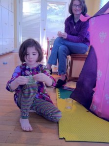 It works like this… Every day, Claire needs to complete three items: get herself dressed, put up her shoes whenever she takes them off, and take her dishes to the kitchen after each meal.  These are pretty easy chores, but we wanted to set Claire up for success.  Of all of then, we have had the most trouble in the past with Claire dressing herself, of all things.  She just really likes when we help her get dressed.  Anyways, for every day that Claire does all of those things, she gets 50 cents.  And on Sundays, we all clean up the play area together.  If Claire participates in the clean up, she gets a bonus of $1.50, bringing her weekly total to $5.00.  The allowance would be distributed as cash immediately after the clean up.  This whole thing may sound a little confusing, I guess, but basically she gets $5 a week as long as long as she does all her chores, and we have some gradual ratcheting back from there.