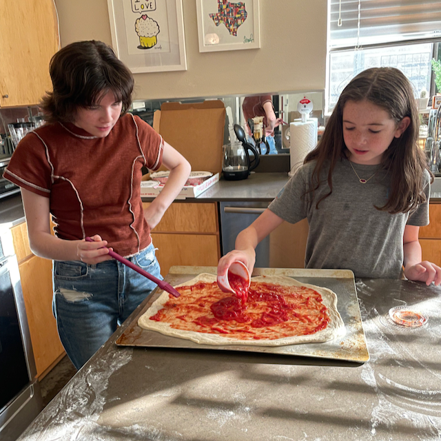 Claire has become the experience at making homemade pizzas from a pizza kit from Homeslize Pizza (the best pizza in Austin).