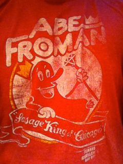 It is sort of a special thing for Molly to say a letter, not an every day occurrence. But there is one very special prop which has Molly saying letters every time. It is my Abe Froman, the Sausage King of Chicago, shirt. Almost every time I am holding Molly while wearing this shirt, she loves to point at the letters and try to guess what they are. She often gets the A, B, and O right. Sometimes she points to the crown after the E, and I just have to say “crown”, which she now thinks is a letter.