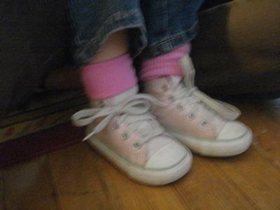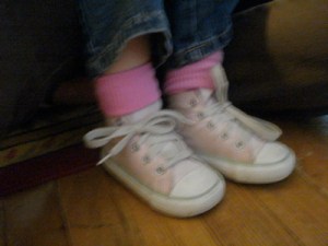 As we all left the store and were on the wide sidewalk walking towards the car, a little toddler boy was heading towards the store with his parents and gramma. Claire ran forward and jumped right in front of the boy, patted herself on the chest, and declared, “This is Claire! Nice shoes!”