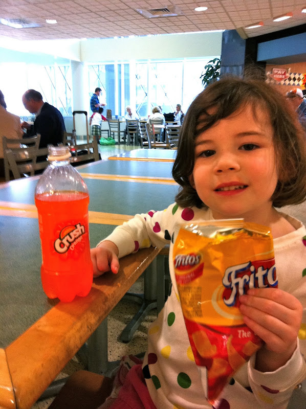 On the plane, we also talked a lot about our route to Santa Fe: fly from Austin to Houston, then fly to Albuquerque by another plane, then take a bus to pick up a rental care, then drive to Santa Fe. Claire jokingly called Albuquerque “Albu-cookie”. In the Houston airport, Claire got to choose pretty much whatever she wanted for lunch, and she ended up with a collection of curiously retro food: Fritos, Orange Crush, and a turkey sandwich. What is this, 1979? By the way, that Orange Crush made it all the way to Santa Fe, where Claire continued to sip on it daily throughout the rest of the trip, and not for lack of other (fresher) options.