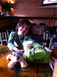 The next morning, Kit headed downstairs for her conference, and Claire and I headed out to explore Santa Fe on foot.  We ended up in the literally freezing wind at the beautiful central plaza.  The cold weather was sort of a shock coming from the balmy weather back home. We ducked into a mall across the street from where there was supposed to be a great breakfast restaurant where we were supposed to be having a nice warm breakfast right now.  But alas, the restaurant was closed for remodeling.  The mall, and actually the whole city, was empty, I guess because it was Sunday morning and everything was closed.  We slowly trudged our way back two or three blocks to the hotel, ducking in for cover from the wind as the situation allowed.  Claire complained bitterly about the cold, which was not like her. She did not even want to walk and asked me to carry her the whole way. We made it to the hotel and eventually took the car to an open restaurant (which we ended up going to three different times) where we warmed up over some breakfast and a gigantic hot chocolate, which Claire barely touched.