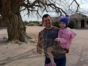 The next day, we took the 90-minute drive to Taos to see the 1000-year-old pueblo.  I explained to Claire that when pilgrims landed in American, this village was already here, and it was already hundreds of years old.  That actually did impress Claire, who responded with a genuine, “Wow!  Really?”  The drive to Taos was scenic, and it was a good chance for Claire to sit and rest up.  At Claire’s behest, we played “Max and Emma” for almost the whole drive up and back.  This is a game where Claire is a girl once year older than Claire named Emma, and I am her little toddler brother named Max.  Occasionally Emma reverts to a baby, but usually she’s older.  The game is mostly about talking funny, and she especially like when little Max badly slurs his “S” sounds because he’s a toddler.  She’ll also give me ideas to riff on, such as, “Pretend you think those rocks are giant meatballs and you want to eat them, and you get really upset because you can’t…” Anyways, that got us to Taos.
