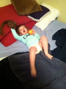 Molly was kept close at hand the whole time at Tim’s house to keep her from provoking Tim’s two sweet but large and energetic dogs, as well as the general watch to “keep Molly’s body safe” as we are always like to do.  Plus Molly generally needed to sleep during most of the hours actually in Tim’s house.  She did like to play in the guest room bed and eat apples, though.