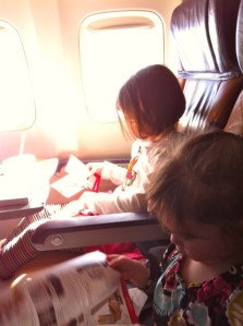 The flight went surprisingly well.  We thought it might be tough for Molly to sit more or less still in a seat for three hours, and to not scream and cry when she inevitably got frustrated by sitting there so long.  But she actually seemed to enjoy the flight quite a lot.   She seemed to enjoy the novelty of the airplane experience.  She browsed in-flight magazines and catalogs from the seat in front of her.  Then she collected all the duplicate in-flight magazines and catalogs from the adorning seats.  Then she stacked them all on the seat next to herself just so.  Don’t even think about touching those magazines!  Don’t so much as look at them!  Any disturbing of the in-flight magazine stack immediately caused a shrieking protest from Molly.  But she always settled right back down once you … left … the … damn … magazines … alone.